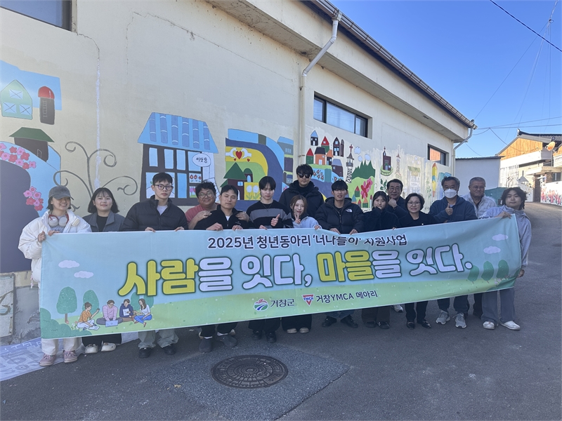 거창YMCA 소속 대학생 동아리 ‘메아리’는 지난여름 활동 기록으로 남겼던 작품을 동산마을 창고 벽면을 활용하여 벽화작업을 진행하였다.이번 벽화작업은 동산마을 기억프로젝트 일환으로 노후화된 담장 개선은 물론 동산마을 직접 표현하는 작품으로 ‘사람을 잇다, 마을을 잇다’라는 미션을 바탕으로 진행되었으며, 9월 벽면 청소를