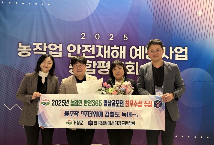 거창군은 지난 11월 20일 농촌진흥청이 주최한 ‘2025년 농작업 안전 재해 예방 사업’ 종합 평가회에서 안전 365 캠페인 영상공모전에 한국생활개선거창군연합회(회장 윤진미)와 관의 협력으로 만든 영상이 최우수상을 받았다고 밝혔다.올해 한국생활개선거창군연합회는 군과 협력하여 농업인의 안전 인식 제고를 위해 농작업 안전