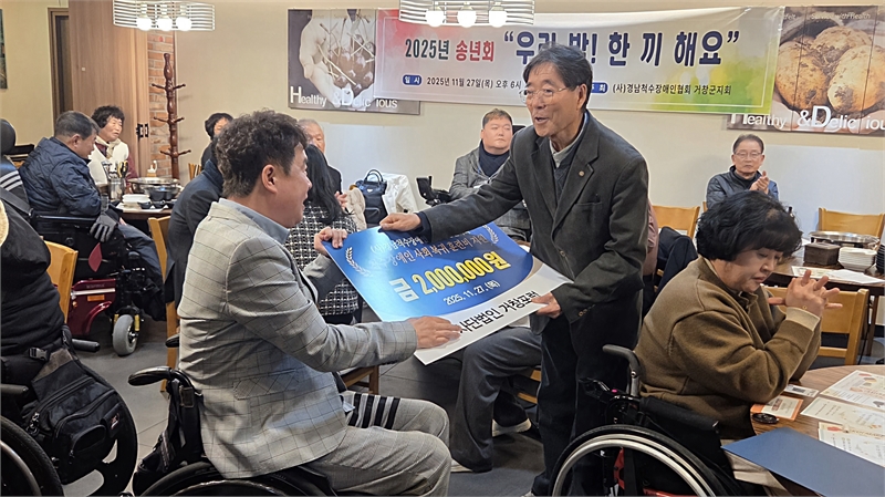 척수장애인협회거창군지회(지회장 김경진)는 지난 11월 27일 (사)거창포럼(회장 김칠성)에서 척수장애인협회 거창군지회에 척수 장애우들의 사회 복귀 훈련비 200만 원을 지원하였다고 밝혔다.이날 거창읍의 한 식당에서 척수 장애우와 내외빈 100여 명이 모여 회원들과 그동안 척수 장애우들에 대한 따뜻한 관심과 사랑을 베풀어