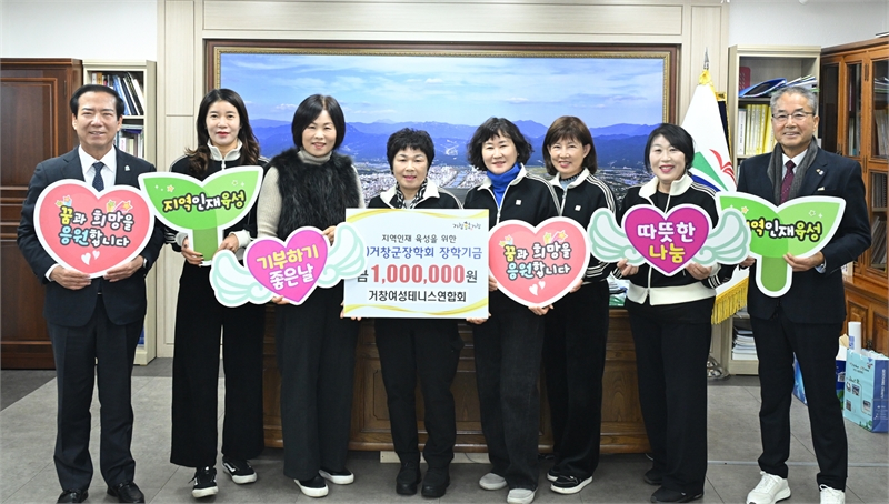 (재)거창군장학회는 지난 12월 16일 지역인재 육성을 위해 거창여성테니스협회(회장 신순덕)에서 회원들이 모은 성금 100만 원을 장학회에 기탁했다고 밝혔다.거창여성테니스연합회는 80여 명으로 구성되어 생활체육 활성화와 회원 간 화합은 물론, 지역사회 공헌 활동에도 적극 참여하며 건강한 지역 공동체 조성에 기여하고 있는