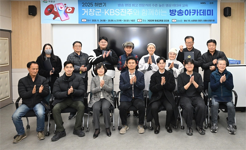 거창군은 지난 11월 24~28일 중 4일간 경남도립거창대학 평생교육원에서 거창군과 KBS 진주방송국이 협력해 운영한 ‘2025년 하반기 방송아카데미’ 교육을 성공적으로 마무리했다.이번 교육은 거창군민 대상으로 농업종사자·학생·공무원 등 다양한 직업을 가진 15명이 교육생으로 참여했다. 강의는 방송기자, AI 콘텐츠 전