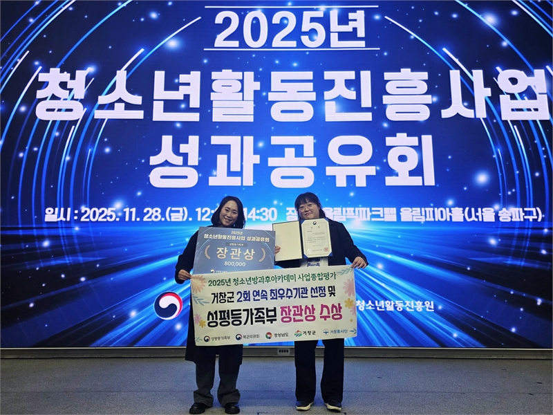 거창군 청소년방과후아카데미(거창흥사단 운영)는 지난 11월 28일에 서울올림픽파크텔에서 열린 ‘2025년 청소년방과후아카데미 사업 종합평가’에서 최우수기관으로 선정돼 성평등가족부 장관상을 수상했다고 밝혔다.청소년방과후아카데미 사업 종합평가는 사업의 질적 성장을 도모하기 위해 전국 농산어촌형, 장애형, 다문화형 등 총 1