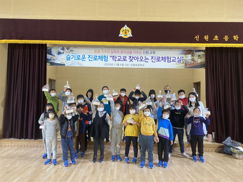 신원초등학교(교장 제인식)는 지난 11월 4일 전교생(병설 유치원 제외)을 대상으로 ‘학교로 찾아오는 진로체험활동’이라는 주제로 자신의 꿈을 실현하기 위한 진로체험활동에 준비하였다. 학생들이 평소 관심 있어 하는 직업 중 하나인 제과제빵사를 학교에서 직접 체험할 기회를 제공하였다.
