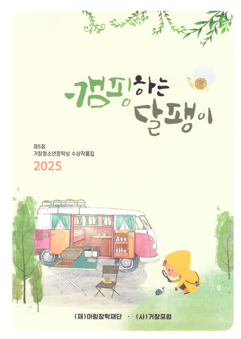새로 나온 책 ‘캠핑하는 달팽이’는 대상 입상작 2편을 비롯하여 금상 6편, 은상 12편, 동상 18편, 장려 62편과 심사평(이상영/전 거창문학회장) 그리고 제5회 거창청소년문학상발표대회 전 진행 과정을 소상히 밝히고 있다.