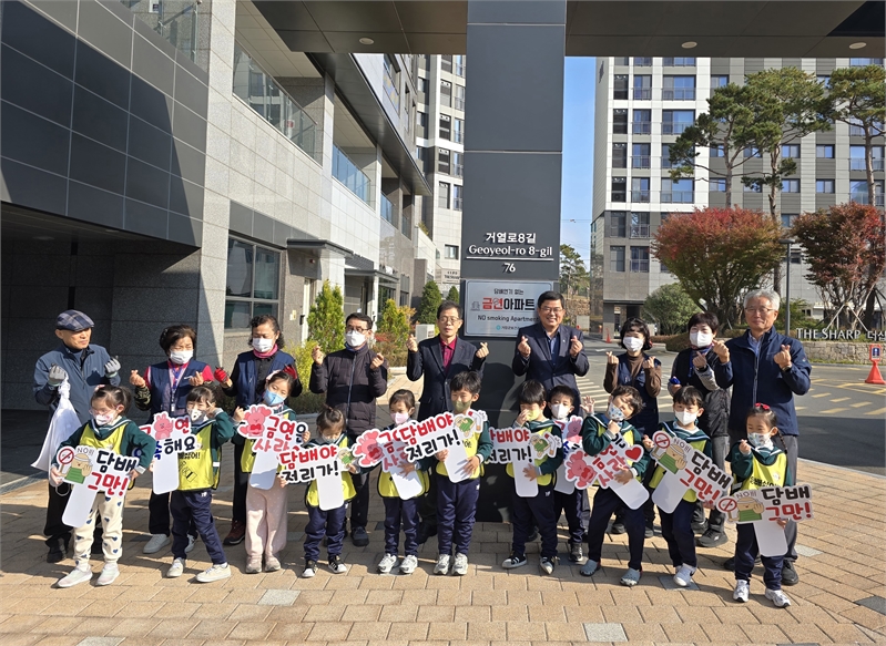 이날 행사에는 이정헌 보건소장, 박범수 입주자대표, 김윤호 관리사무소장 외 직원, 숲아이어린이집 유아, 선생님 등 20여 명이 참석해 금연 실천을 다짐하고 건강한 아파트 만들기에 뜻을 함께했다.