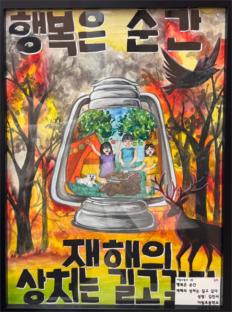 특히 아림초등학교 김민서 학생의 “행복은 순간, 재해의 상처는 길고 깊다” 작품이 경남 도대회 장려상을 받았으며, 도내 다양한 시·군 우수작도 함께 전시된다.