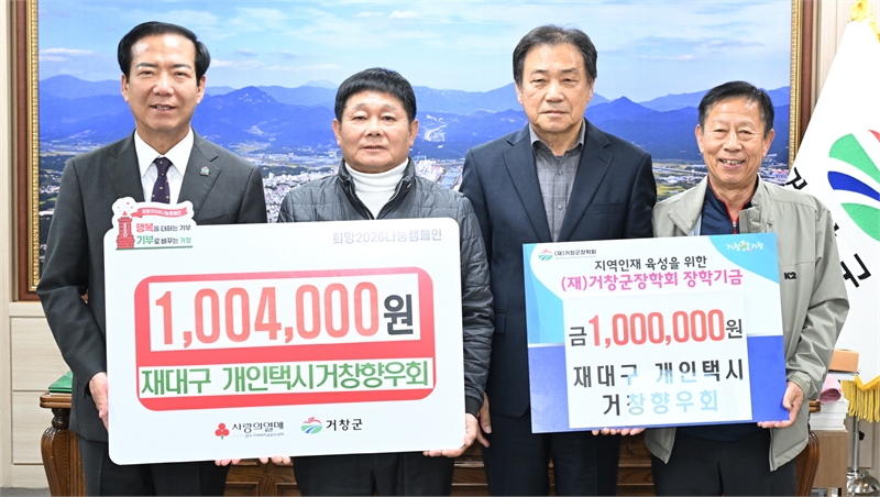 재대구 개인택시 거창향우회(회장 신쾌식)는 고향 후배들과 지역사회를 돕기 위해 회원들이 모은 성금을 기탁했다. 2015년 2,008,000원을 시작으로 2016년부터 2024년까지 매년 1,004,000원을 ‘아림1004운동’에 꾸준히 기부해 왔으며, 2016년부터 거창군장학회에도 매년 100만 원을 기탁해 지역 인재 양성에 지속해서 힘을 보태고 있다.
