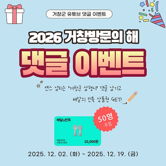 참여 방법은 거창군 유튜브 채널에서 이벤트 영상을 시청한 뒤, 거창방문의 해를 맞은 거창군을 주제로 삼행시로 댓글을 남기면 된다. 참여자 중 50명을 추첨해 ‘배달의 민족 1만 원 상품권’을 지급하며, 당첨자는 오는 23일 18시에 발표된다.