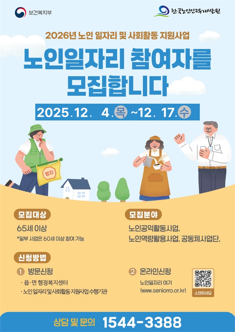 선발은 보건복지부의 노인일자리사업 선발 기준표에 따라 고득점자순으로 공정하게 이뤄지며, 최종 선발자는 내년 1월부터 각 사업에 배치돼 활동하게 된다.