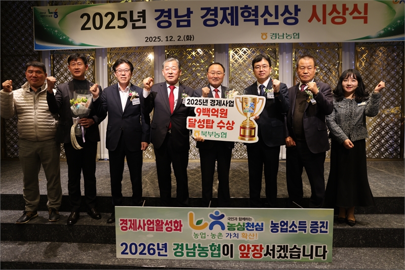 지난 2025년 12월 2일(화)에 농협 경남지역본부에서 북부농협(조합장 신화범) 농협거창군지부(지부장 이희열) 경남농협(지역본부장 류길년)등 100여 명의 농협 관계자들이 모여 2025년 경남농협 경제혁신상 시상식에서 북부농협(조합장 신화범)은 2025년 경남농협 경제사업 혁신상(경제사업 900억 원 달성탑)을 수상하였다