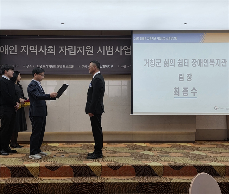 거창군은 지난 12월 11일, 서울 프레지던트호텔에서 열린 ‘2025년 장애인 자립 지원 시범사업 성과공유회’에서 삶의 쉼터 장애인복지관 최종수 팀장이 지역사회 자립지원과 권리 보장에 기여한 유공으로 ‘보건복지부 장관 표창’을 수상했다고 밝혔다.