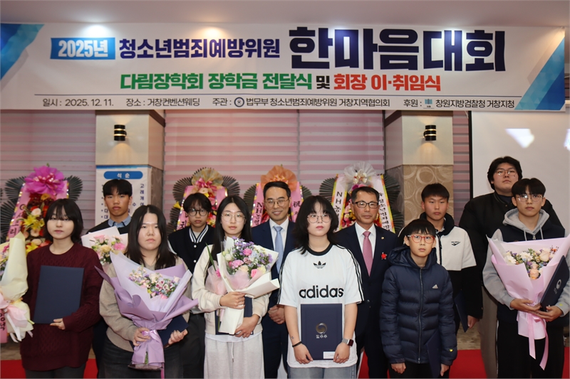 법무부 청소년범죄예방위원 거창지역협의회(회장 최병철)가 주관하고, 창원지방검찰청 거창지청(지청장 이세종)이 후원하는 ‘2025년 청소년범죄예방위원 한마음대회, 다림장학회 장학금 전달식 및 회장 이·취임식’이 지난 12월 11일(목), 이세종 지청장과 유관단체장, 청소년범죄예방위원 및 자원봉사위원 등 120여 명이 참석한 가운데 거창컨벤션웨딩에서 개최되었다.
