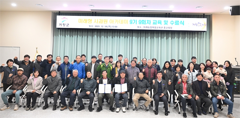 거창군은 지난 12월 18일 농업기술센터 미래농업복합교육관 2층 중교육장에서 49명의 교육생이 참석한 가운데 ‘미래형 사과원 아카데미 9기’ 수료식을 개최했다.