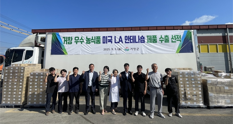 거창군에서 생산된 농식품이 미국 로스엔젤리스(LA) 소비자들에게 본격적으로 선보인다.군은 지난 9월 5일 ‘거창 우수 농식품 미국 LA 안테나숍’ 출하 행사를 열고 17개 품목, 약 2만 9천 달러(한화 약 4천만 원) 규모의 수출물량을 선적했으며, 사과즙, 건조여주, 콜라겐, 청국장, 부각 등 건강과 전통을 담은 다양